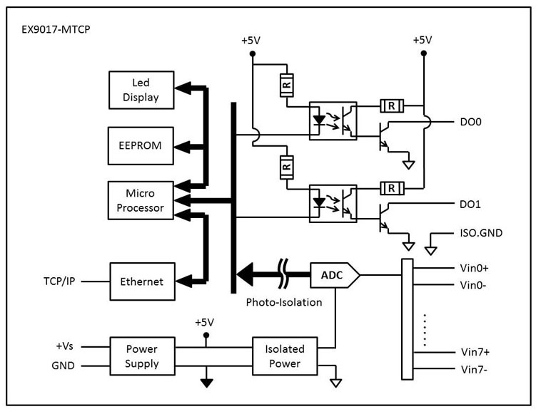 EX9017-MTCP – 8 isolated analog Input & 2 digital output channels with ModbusTCP module