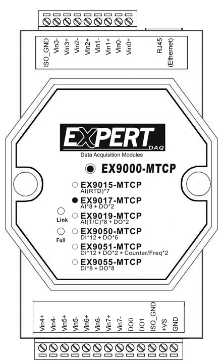 The EX9017-MTCP is a 16-bit, 8-channel analog differential input module that provides programmable input ranges on all channels. It accepts millivoltage inputs (±100mV, ±500mV), voltage inputs (±1V, ±5V, and ±10V) and current input (±20 mA, 4~20 mA) and provides data to the host computer in engineering units (mV, V or mA).