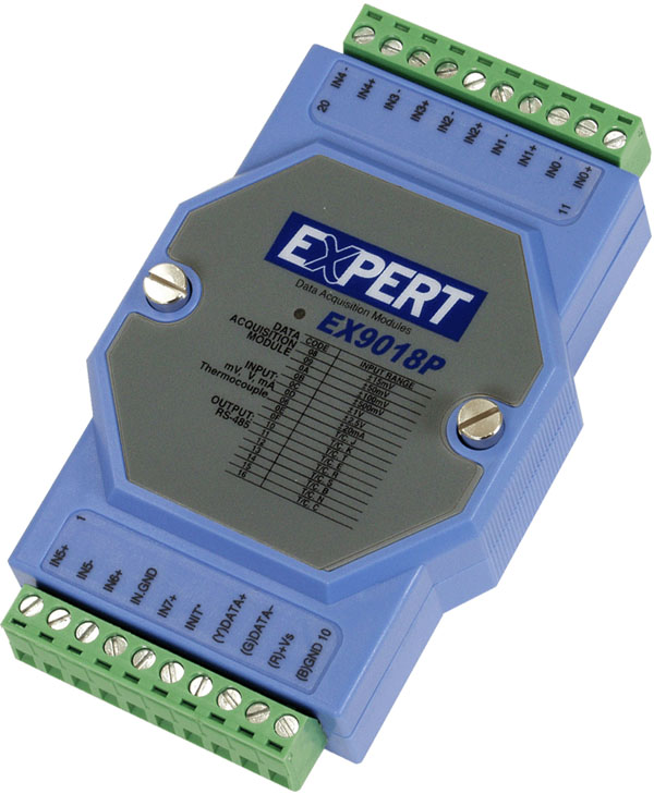 The EX9018BL-M Analog In 16bit module for thermocouple excels at use for temperature measurement with one of the sensors B, C, E, J, K, N, R, S, T or may be used to measure analog voltages or currents.