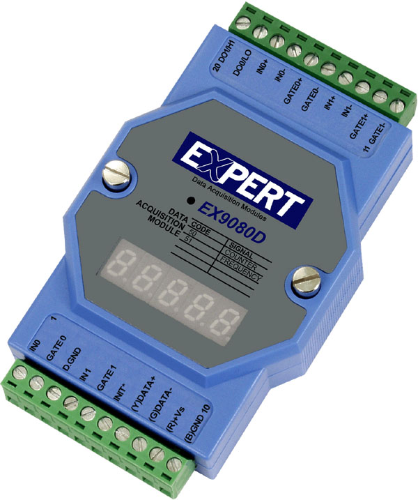 EX9080RD-M – 2 channel isolated counter/frequency input, 2 channel open collector output module with Modbus RTU and 7 segment LED